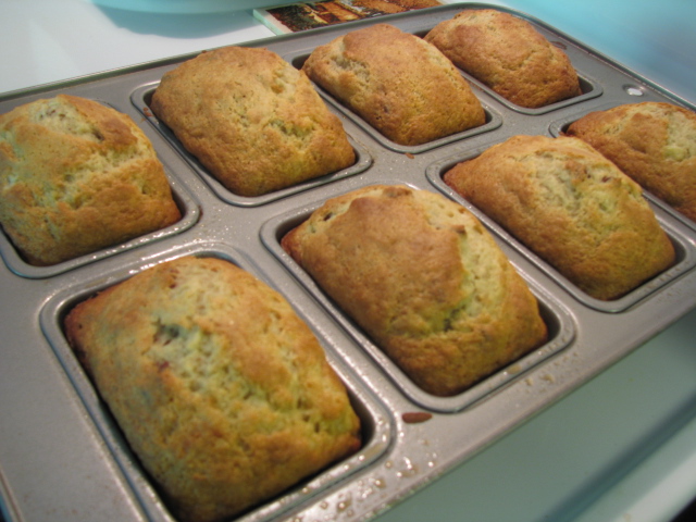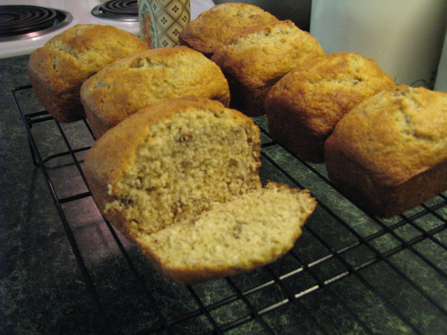 Preheat oven to 350 degrees. Grease a loaf pan or buncha mini loaf pans (how we do it.) Mix eggs and bananas in large bowl. Mix in flour, sugar, salt and baking soda. Add pecans. Spoon batter into pans (if you’re using a big loaf pan, fill about 3/4 full. For mini loaf pans, fill to slightly better than half full.) Bake (for loaf pan, 1 hour. For mini loaf pans, adjust time randomly–for the pans we have, it took about 20 minutes.) Eat while still warm if at all possible. Otherwise, when cool, store in an airtight container.