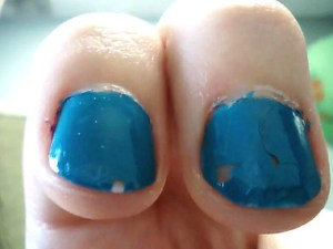 It shattered. I’ve never seen anything like it. Not only did it chip and require a touch-up, the polish actually appears to have shattered in the middle. It’s completely cracked all across the nail, which the photo doesn’t totally show. There are other chips on other nails, as well. Some of the chips are in the middle of the nail. I didn’t do anything too rough with my hands. Certainly nothing that could gouge the polish.