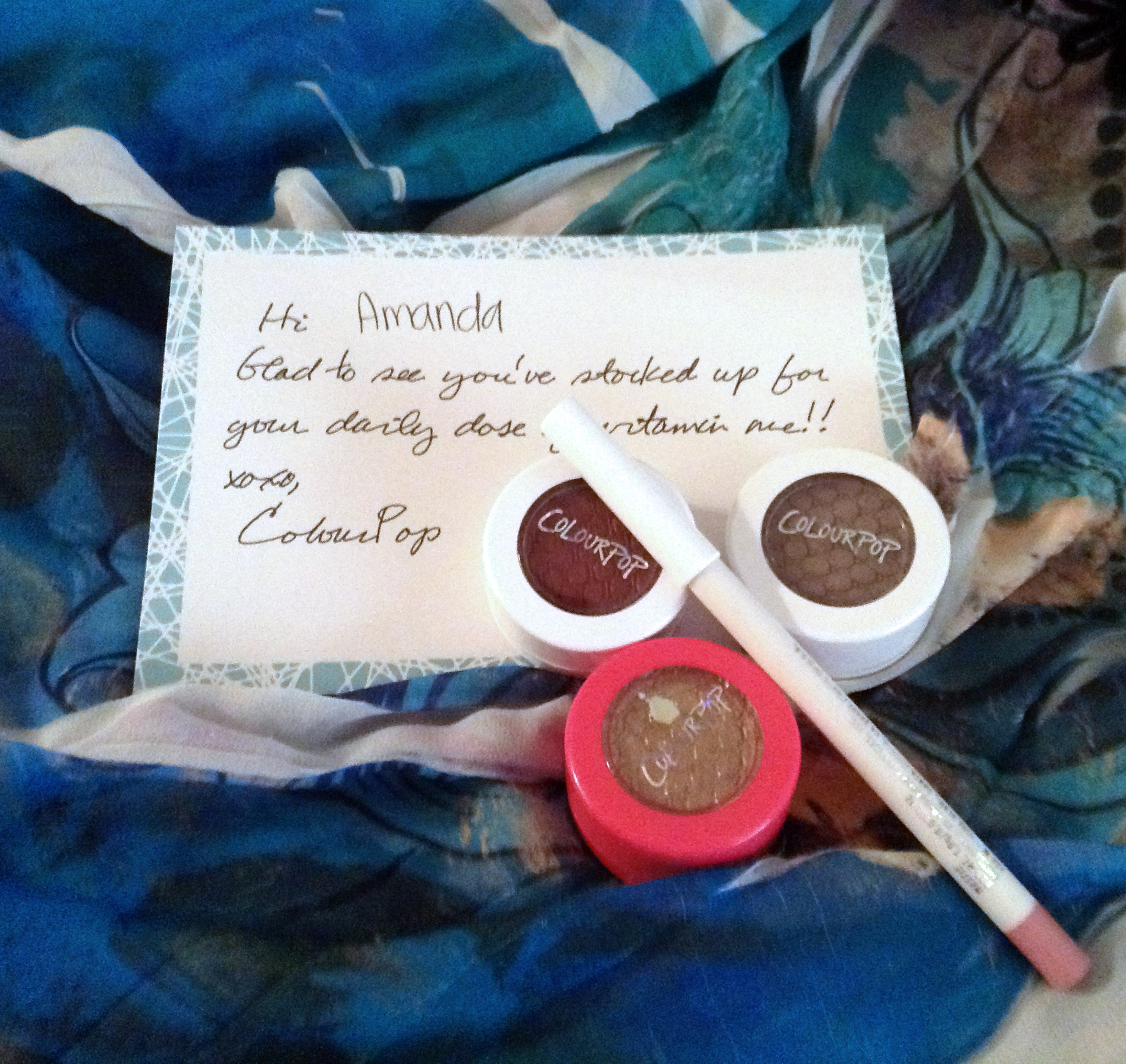 I finally broke down and made a very small order from ColourPop Cosmetics. For the unfamiliar, they’re a makeup brand based in L.A. that doesn’t test products on animals (I’m unclear whether they’re totally “cruelty-free” or not, but they do say that some of their products are vegan.) How cute is it that they handwrite every customer’s name on their thank-you cards? They also include postcards with product suggestions and instructions.